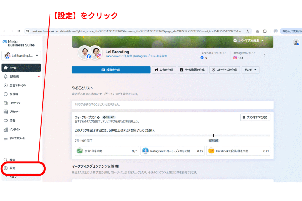Meta Business Suiteの管理画面左にあるメニューより「設定」 をクリックします。