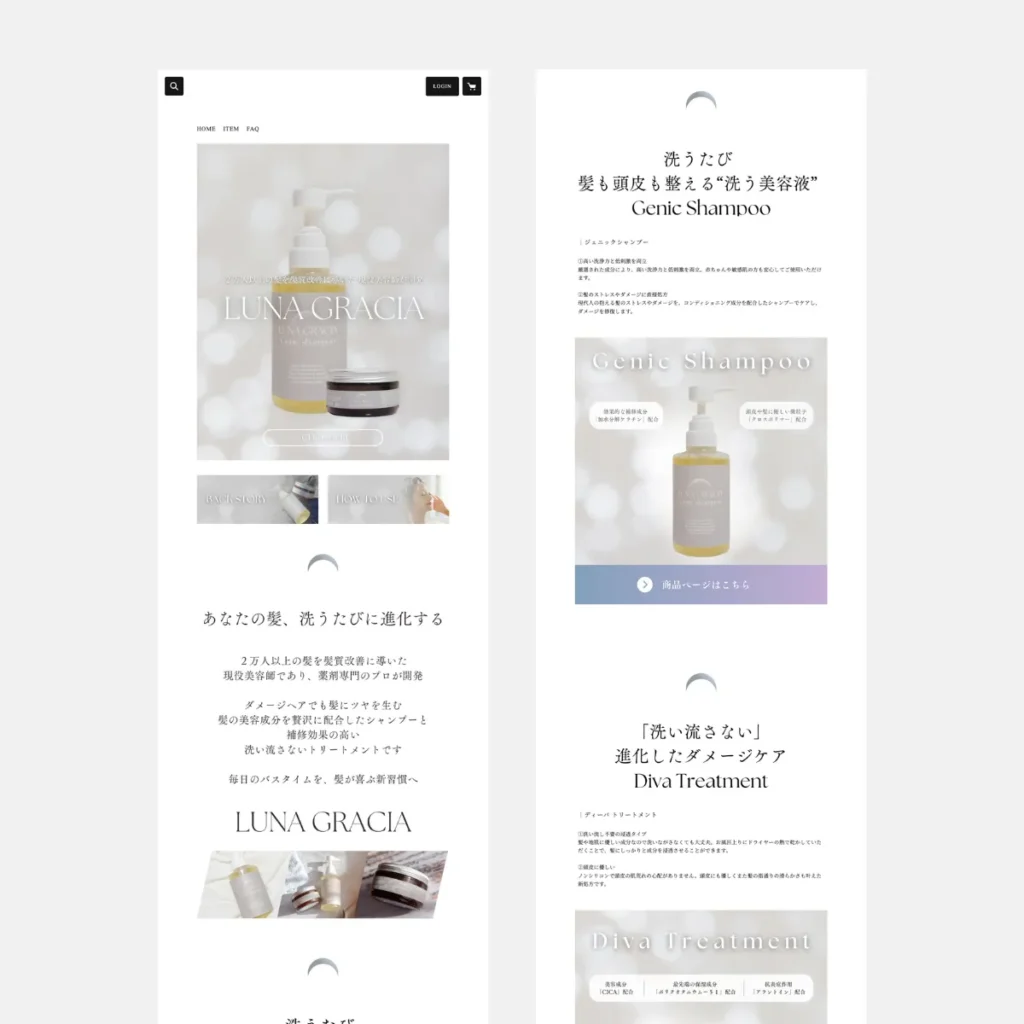 ECサイト制作 STORES 株式会社新倉美化学研究所様のLUNA GRACIAのECサイトを制作させていただきました 2025年2月5日 2025年11月26日 reico 2025.2月株式会社新倉美化学研究所様のLUNA GRACIAのECサイト(STORES)を制作させていただきました。出品点数が、シャンプーとトリートメントの2点であることから、STORESのトップページをLPサイトのようなデザインで制作しています。 STORES 実際のサイトはこちら ■ いただいたお客様の声 株式会社新倉美化学研究所様最初から最後までとても親切に丁寧にサポートして頂きました。 また、こちらの要望も細やかな所まで汲み取ってくれた上でご提案をして頂けます。 勿論、作って頂いたページもとても良い仕上がりです! またこれからも引き続き是非お願いしたいと思います。 今後ともよろしくお願い申し上げます。