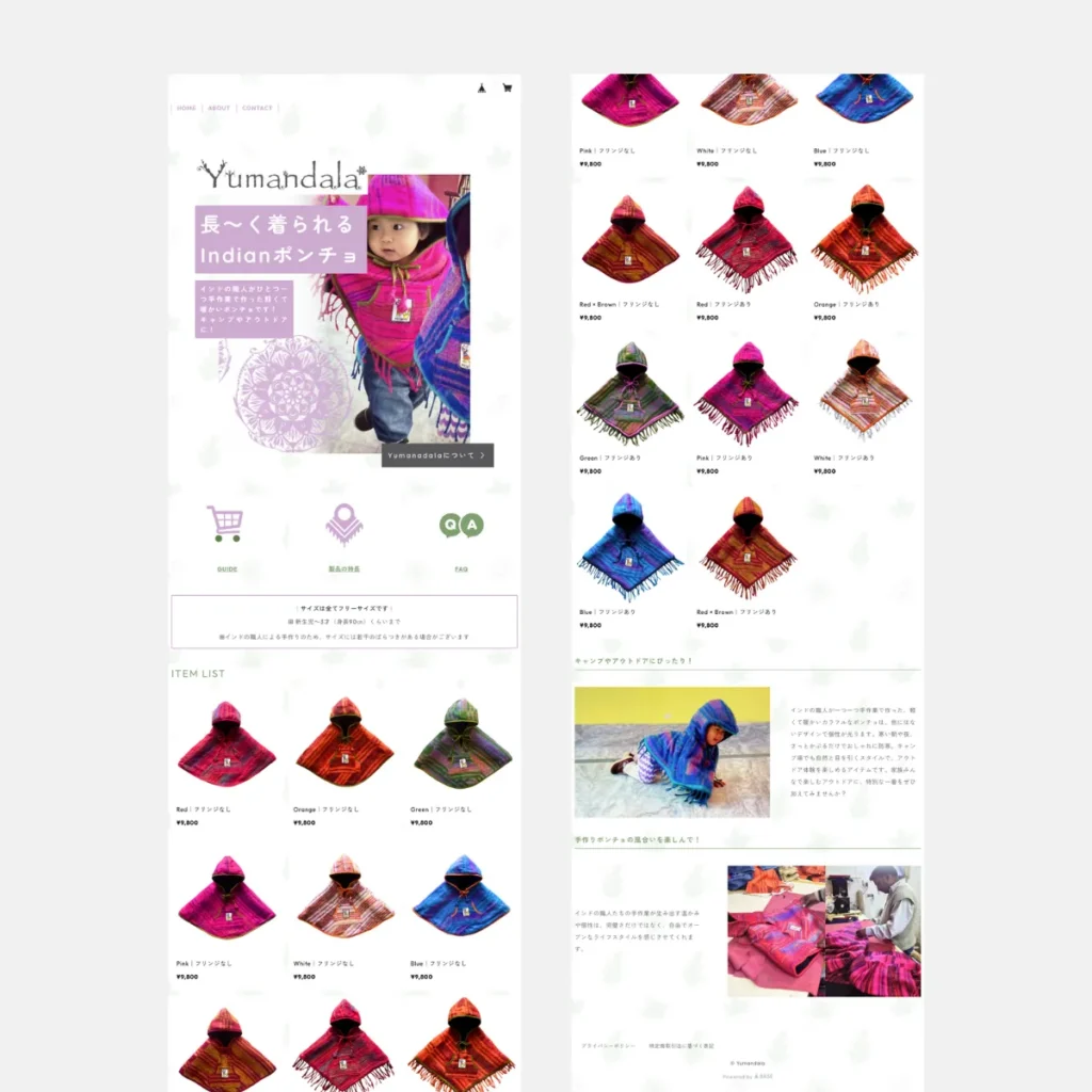 BASE ECサイト制作 子供用ポンチョブランドYumandala様のECサイト(BASE)を制作させていただきました 2024年11月5日 2025年11月26日 reico 2024.11月Yumanadala様のECサイト(BASE)を制作させていただきました。 BASE 実際のサイトはこちら ■ いただいたお客様の声 ゆまんだら様BASEで素敵なお店を作成していただき、 誠にありがとうございました。細部までこだわり、私の希望やイメージをしっかりと反映してくださり、想像以上に素敵な仕上がりに大満足です。また、私はパソコンに不慣れでしたが対応も丁寧でスムーズに進めていただき、終始安心してお任せすることができました。心から感謝しております。今後ともどうぞよろしくお願いいたします。