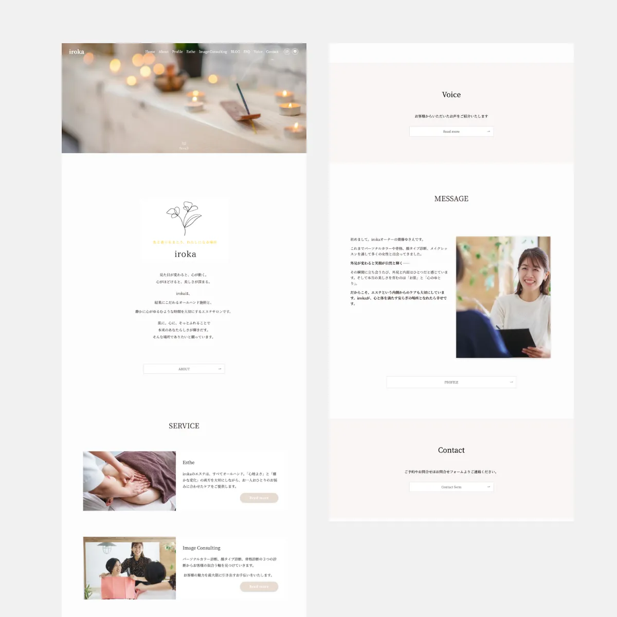 HP制作 エステ&イメージコンサルサロンiroka様のホームページを制作させていただきました 2025年10月29日 2025年11月29日 reico 2025.10月エステ&イメージコンサルサロンiroka様のホームページを制作させていただきました WordPress 実際のサイトはこちら ■ いただいたお客様の声 iroka様私の想いを形にしてくださりありがとうございます。