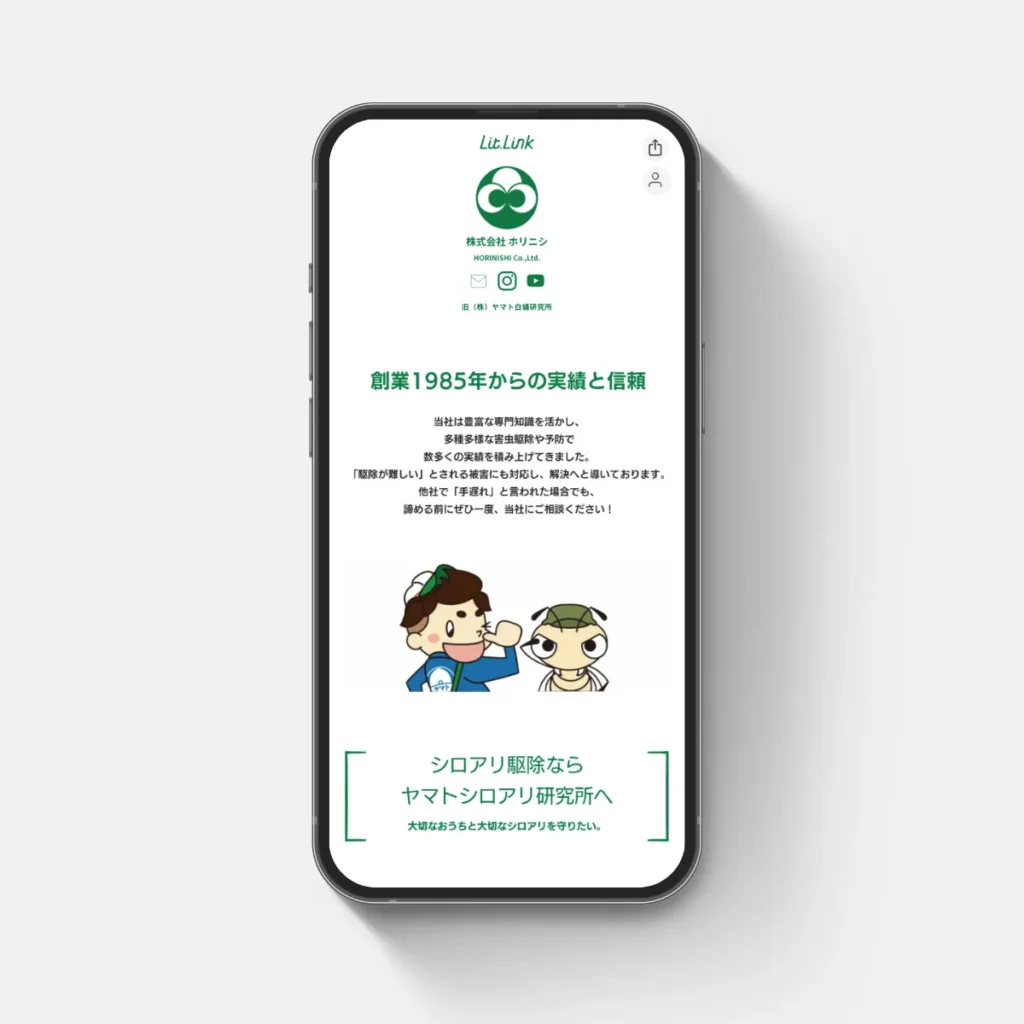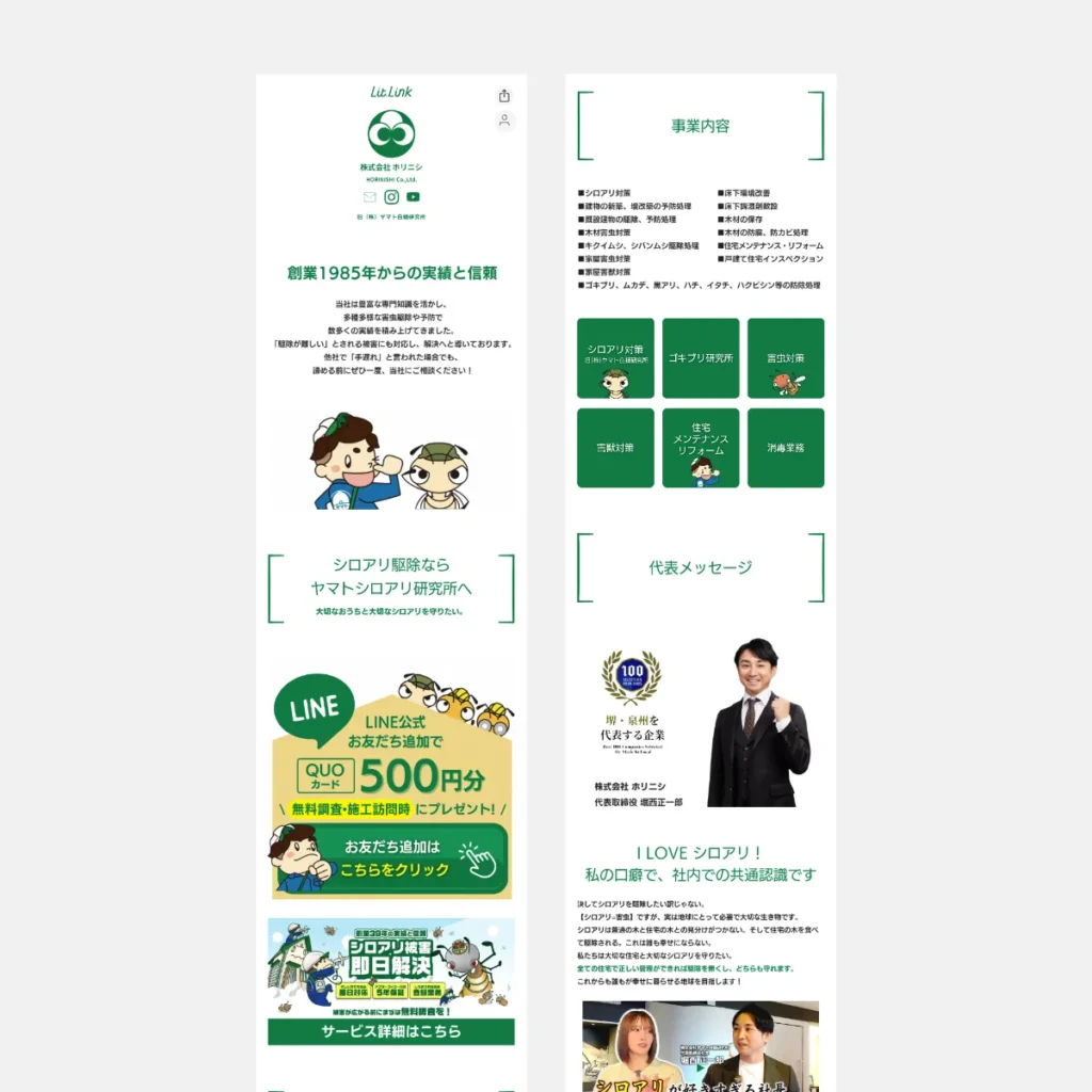 Lit.link制作 株式会社 ヤマト白蟻研究所様のLit.linkを制作させていただきました 2025年1月5日 2025年11月26日 reico 2025.1月株式会社 ヤマト白蟻研究所様のLit.linkを制作させていただきました。 Lit.link 実際のサイトはこちら ■ いただいたお客様の声 株式会社 ヤマト白蟻研究所様この度は、年末年始のお忙しいタイミングでのご依頼となってしまったにもかかわらず、とても丁寧かつ迅速にご対応して頂き終始安心してお取引させていただきました。 完成したリットリンクサイトも、周りの評判も良く素晴らしいの一言です。 作成に入る前に、しっかりとしたヒアリングの時間を設けて頂いたおかげで、双方の認識のずれが無く、理想通りのサイトの完成に最短でお互いストレス無く進行したと実感しております。 周りの経営者仲間にもおススメさせていただきました。 また何か製作等の機会があれば是非よろしくお願いいたします。本当にありがとうございました。
