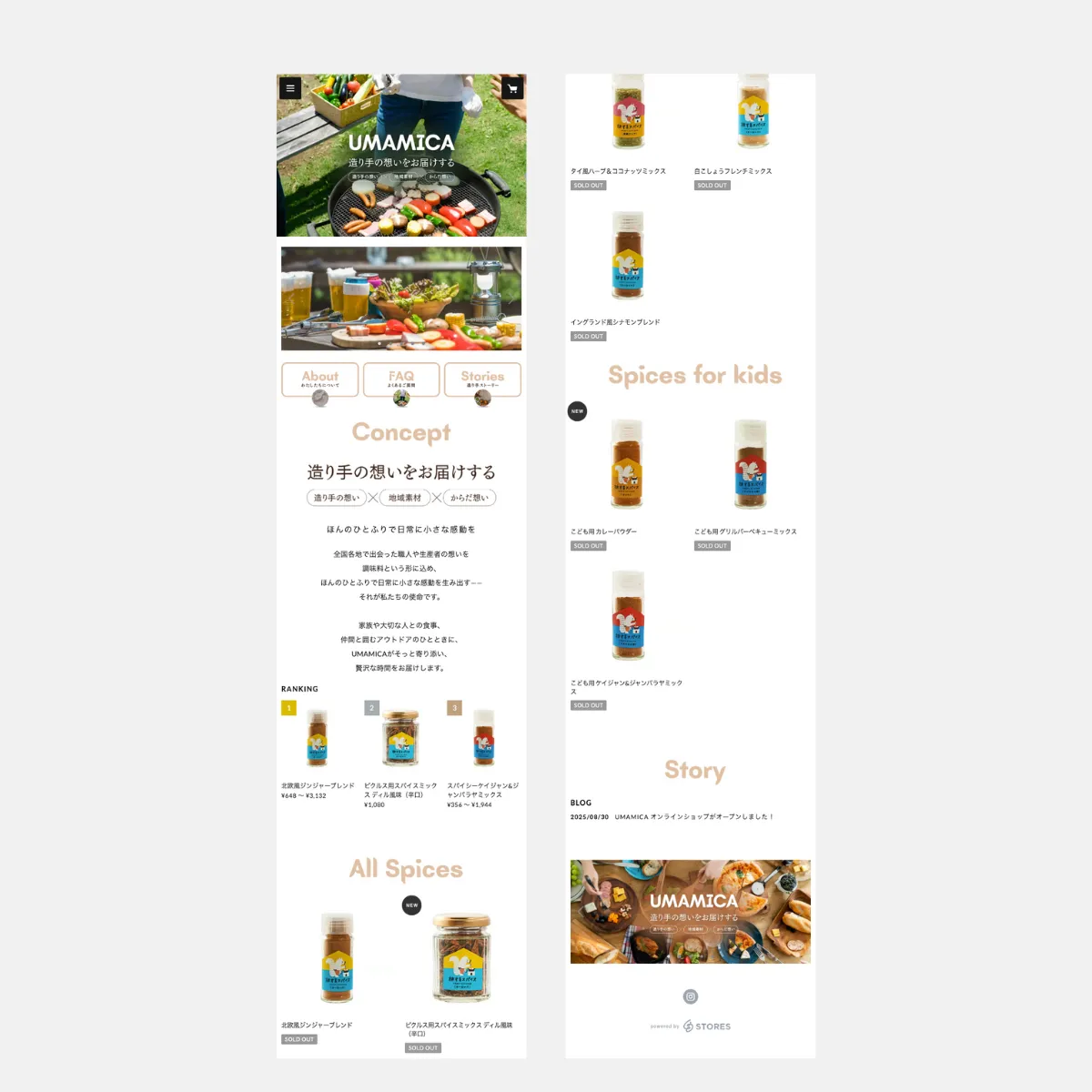 ECサイト制作 STORES UMAMICA様のECサイトの構築・デザインを担当させていただきました 2025年8月8日 2025年11月18日 reico 2025.8月オリジナルスパイスなどの販売用ECサイトをSTORESで制作させていただきました。 STORES 実績サイトはこちら ■ いただいたお客様の声 UMAMICA様はじめて依頼をしましたが、デザインの仕上がりがとても気に入りました。確認事項も細かく丁寧で、納品も迅速でした。 チャットのレスポンスも早く、返信できない時間帯についても事前に伝えていただけたので安心できました。またぜひお願いしたいと思っております。ありがとうございました。