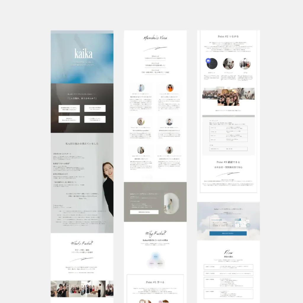 LP制作 Kaika様のLPサイトを制作させていただきました 2025年11月5日 2025年11月29日 reico 2025.11月Kaika様のLPサイトを制作させていただきました。 制作ツールは、Wixです。 Wix 実際のサイトはこちら ■ いただいたお客様の声 KAIKA様この度は丁寧なやりとりに、素敵な仕上げにとても満足しています。 レイさんにご依頼できてよかったです!ありがとうございました。