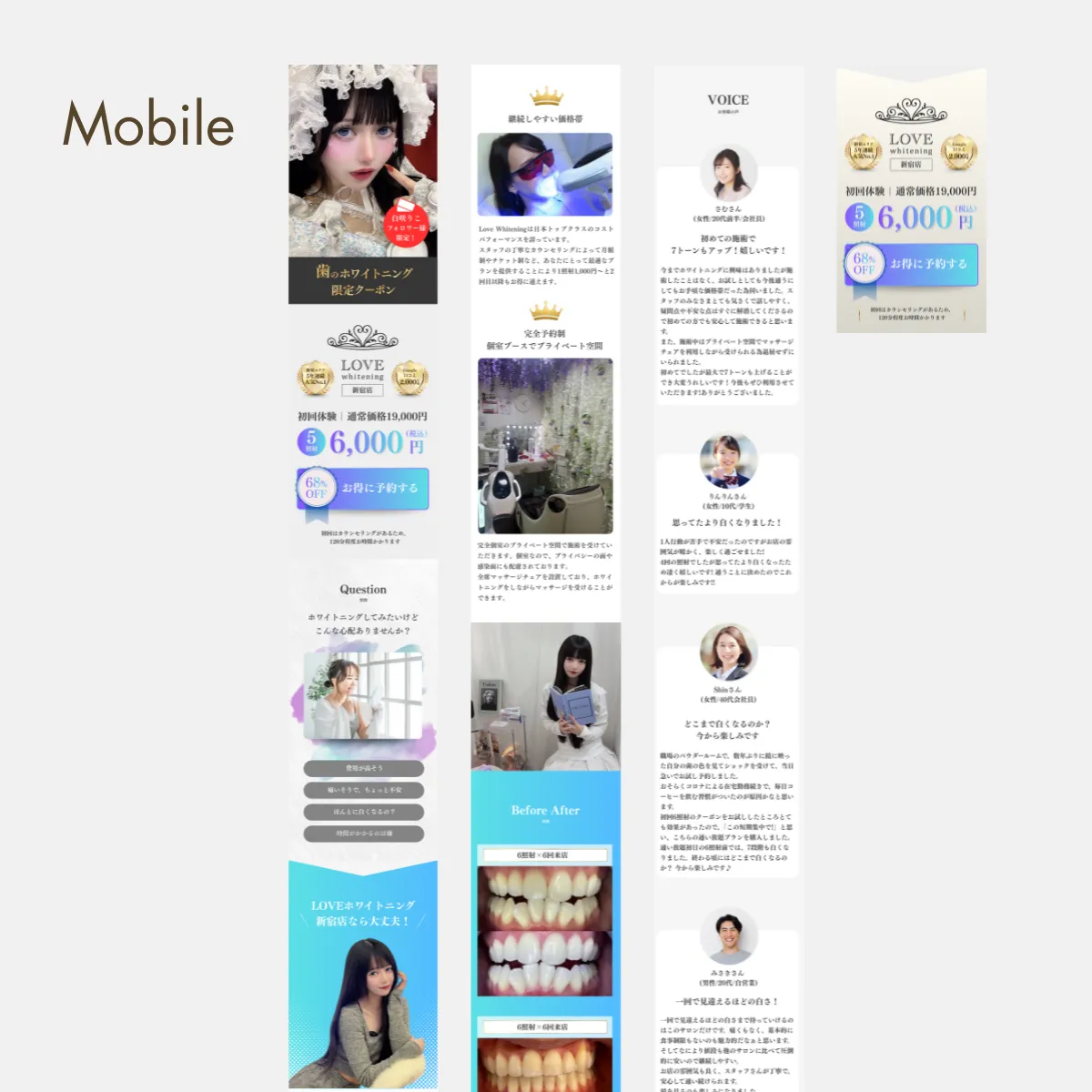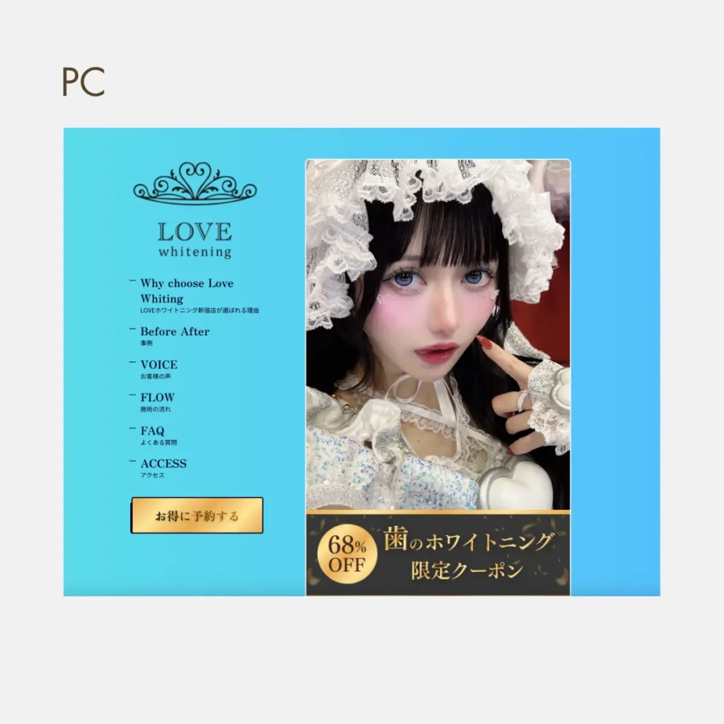 LP制作 LOVE ホワイトニング新宿店様のLPサイトを制作させていただきました 2026年1月29日 2026年2月22日 reico 2026.2月LOVE ホワイトニング新宿店様のLPサイトを制作させていただきました STUDIO 実際のサイトはこちら ■ いただいたお客様の声 LOVE ホワイトニング新宿店様イメージ通りのクリエイティブを製作して頂けました。